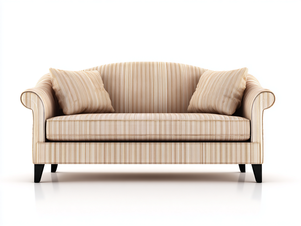 Structure en bois, revêtement en tissu beige à rayures fines.